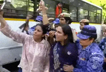 દેખાવકારોને વિખેરવા માટે દિલ્હી પોલીસે વોટર કેનનનો ઉપયોગ કર્યો હતો. કેન્દ્રીય મંત્રી રક્ષા ખડસે, સાંસદ બાંસુરી સ્વરાજ અને કમલજીત સેહરાવતની અટકાયત કરવામાં આવી હતી. કાળી પટ્ટીઓ બાંધીને મહિલા નેતાઓએ સૂત્રોચ્ચાર કર્યા કે, ફૂલ નહીં ચિંગારી હૈ, હમ ભારત કી નારી હૈ.