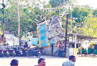– આવેલા વાવાઝોડામાં બેનરોના પતરા તૂટીને જોખમી રીતે લટકી રહ્યાં છે : મુસાફરોના જીવ જોખમમાં